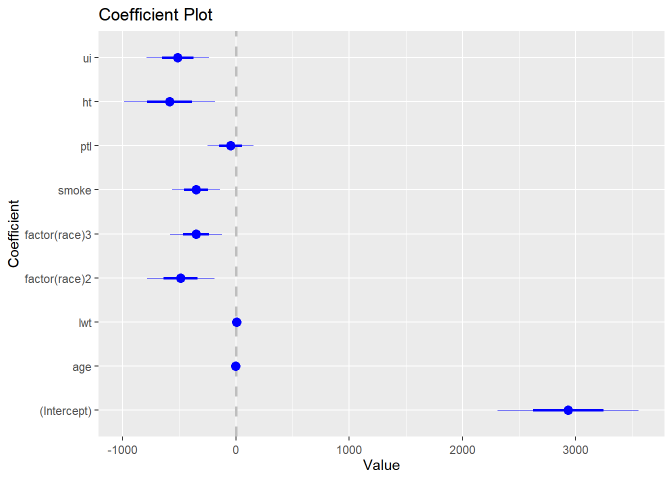 lm(formula = bwt ~ lwt + factor(race) + smoke + ht + ui, data = birthwt)