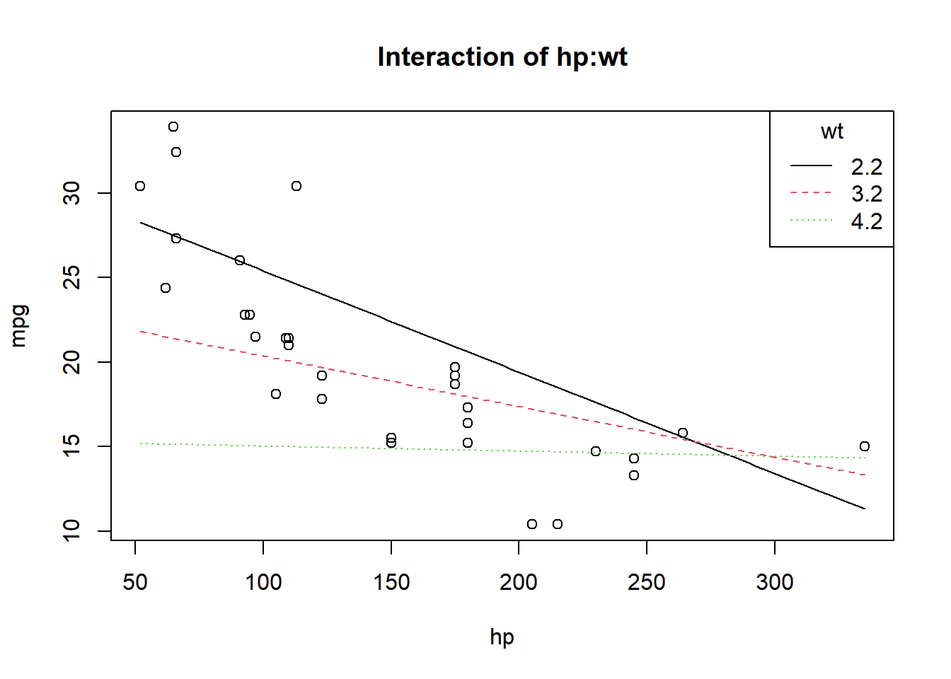 lm(formula = mpg ~ hp * wt, data = mtcars)