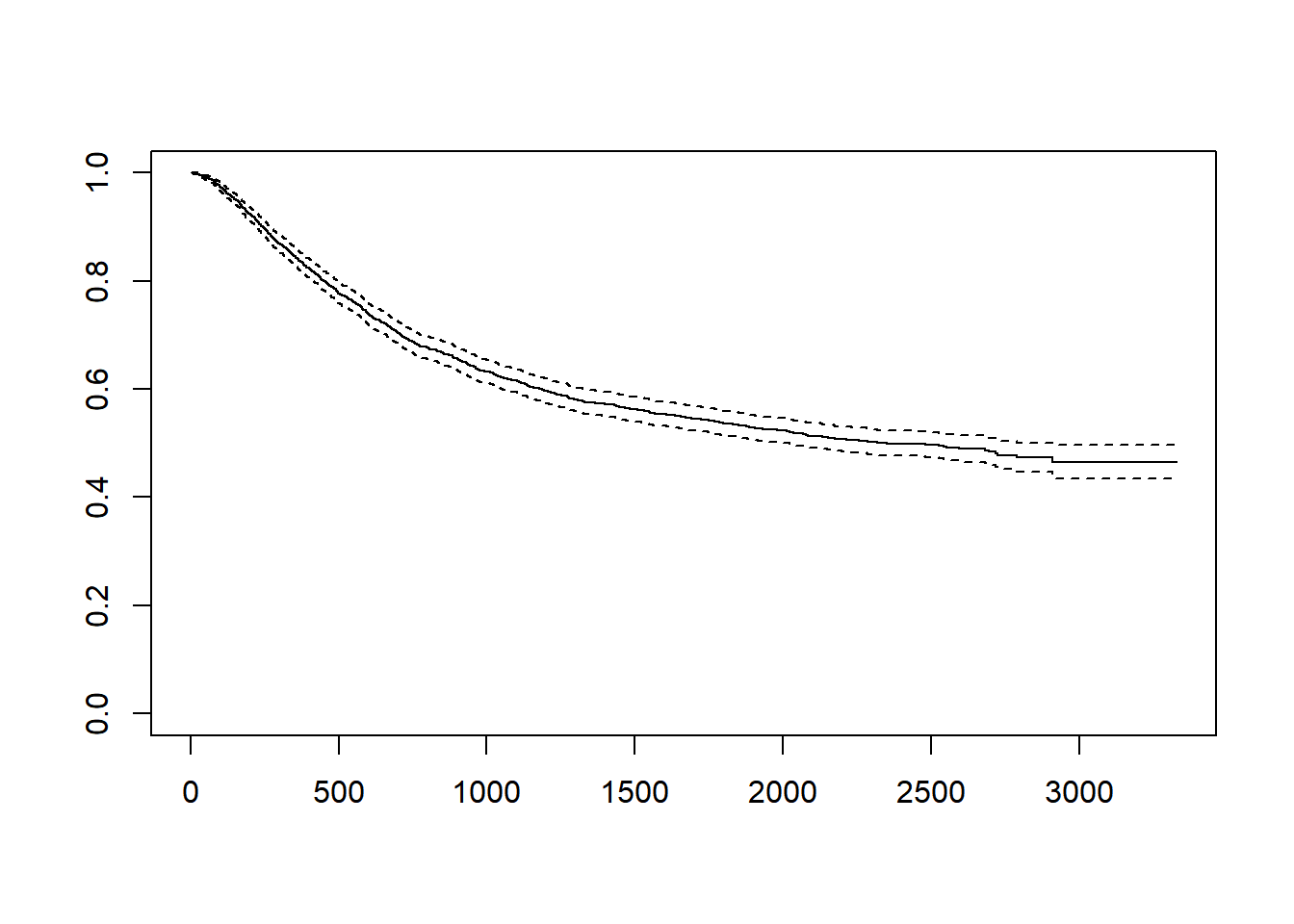 #Kaplan-Meier Curve 가운데 선이 KM curve이고 점선은 95% 신뢰구간입니다