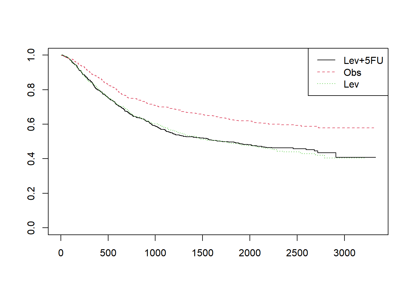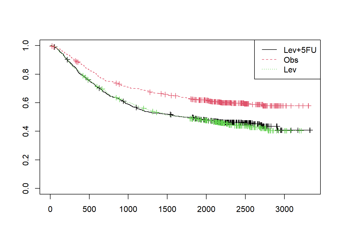 legend("topright", legend=unique(colon$rx), col=1:3, lty=1:3)