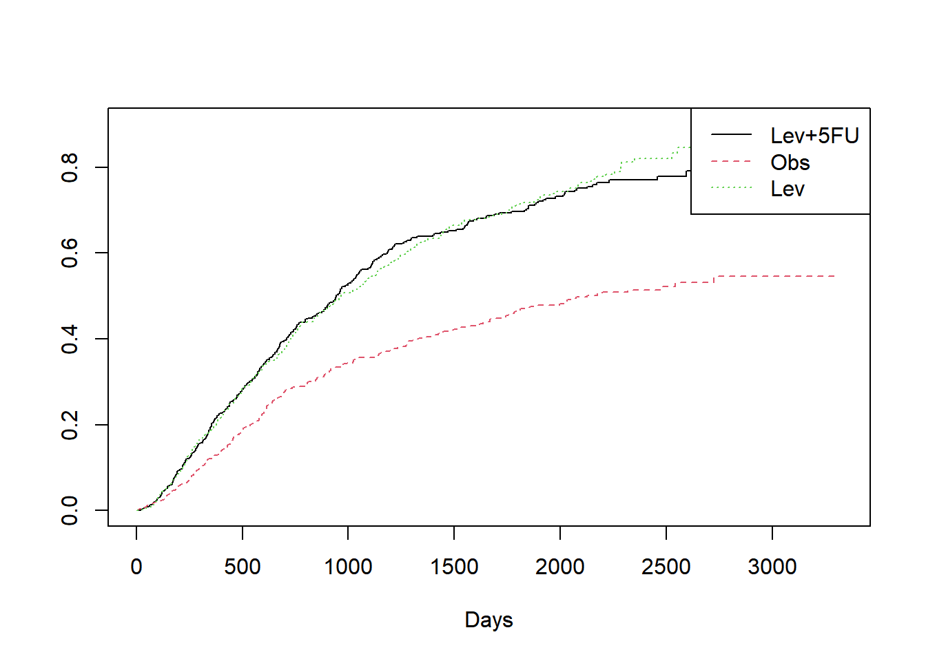 fit = survfit(Surv(time,status==1)~rx, data=colon)